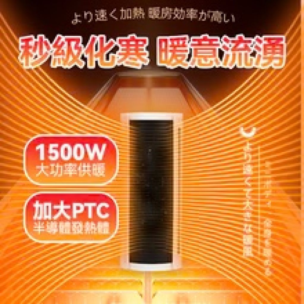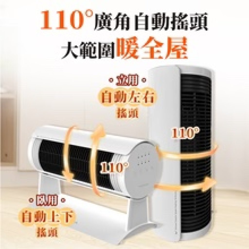上下自動搖頭110°,縱向放置即變成左右自動搖頭110°,廣角送暖、循環加熱,隨時調節暖風送達位置